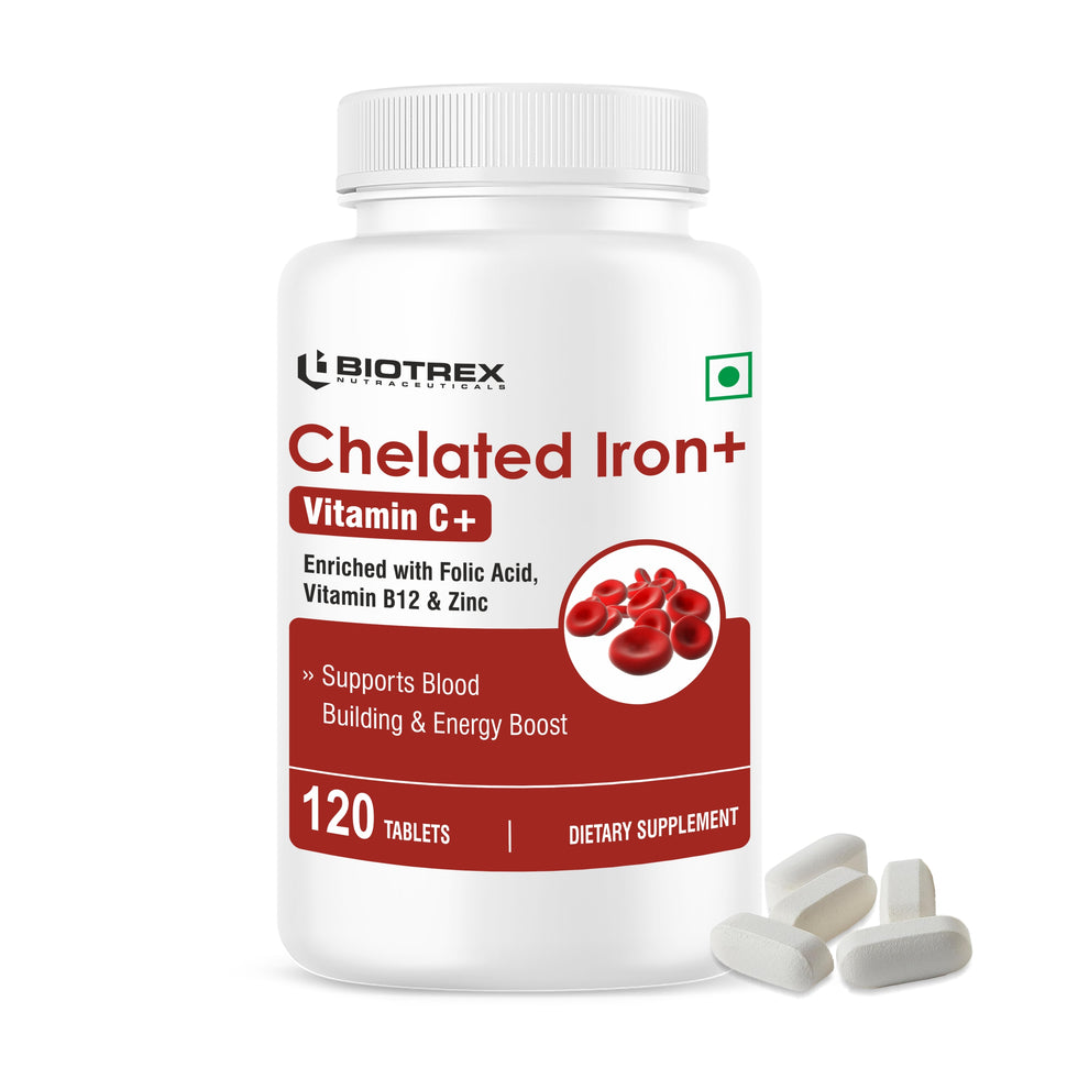 Biotrex Chelated Iron + Vitamin C, B12, Folic Acid & Zinc, Boost Hemoglobin Levels & Improves Concentration Levels, Energy & Blood Building – 120 Vegetarian Tablets ❌ არ არის რეკომენდებული ❌